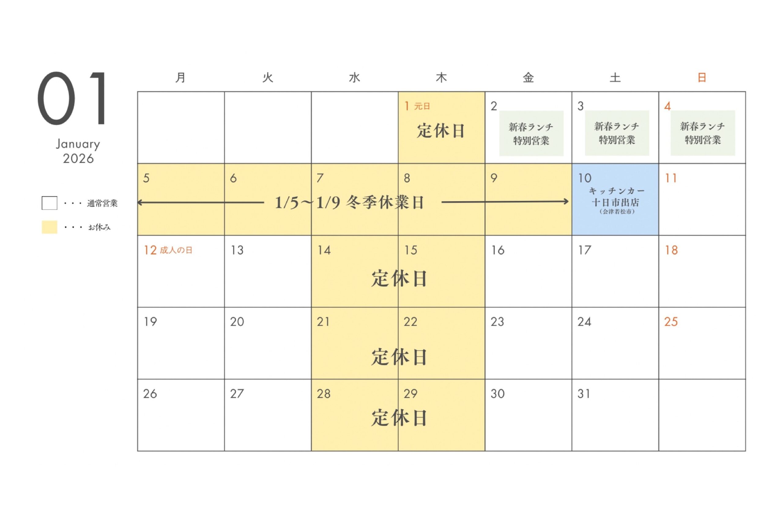 ※成人の日に伴い、第2週目は10日(土)と11日(日)に営業いたします。